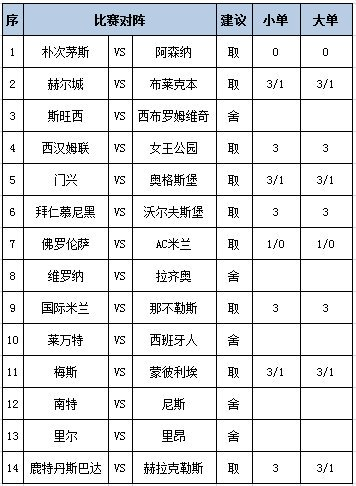 本期任九在4场足总杯+2场德甲+3场意甲+1场西甲+3场法国杯+1场荷甲的基础上舍弃了几场让步较浅的比赛:斯旺西上场在联赛中客场1-2不敌米尔沃尔,结束了自己2连胜的彩票走势,状态回落,足彩本场主场面对上场在联赛中客场1-2不敌莱切城,第期遭遇2连败,任梅发挥走低的新浪西布朗,机构给出在平手的彩票让步幅度,对于两队都没有倾斜,足彩此役舍弃;